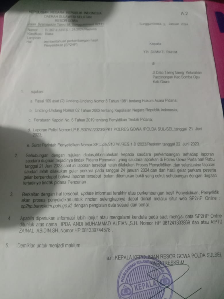Sebelumnya ia melaporkan kejadian ini di tahun 2023 lalu tepatnya tanggal 21 Juni. Berdasarkan Laporan Polisi: LP.B/637/VI/2023/SPKT Res Gowa Polda Sulsel.
