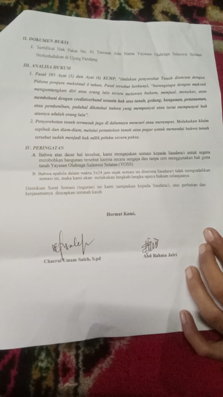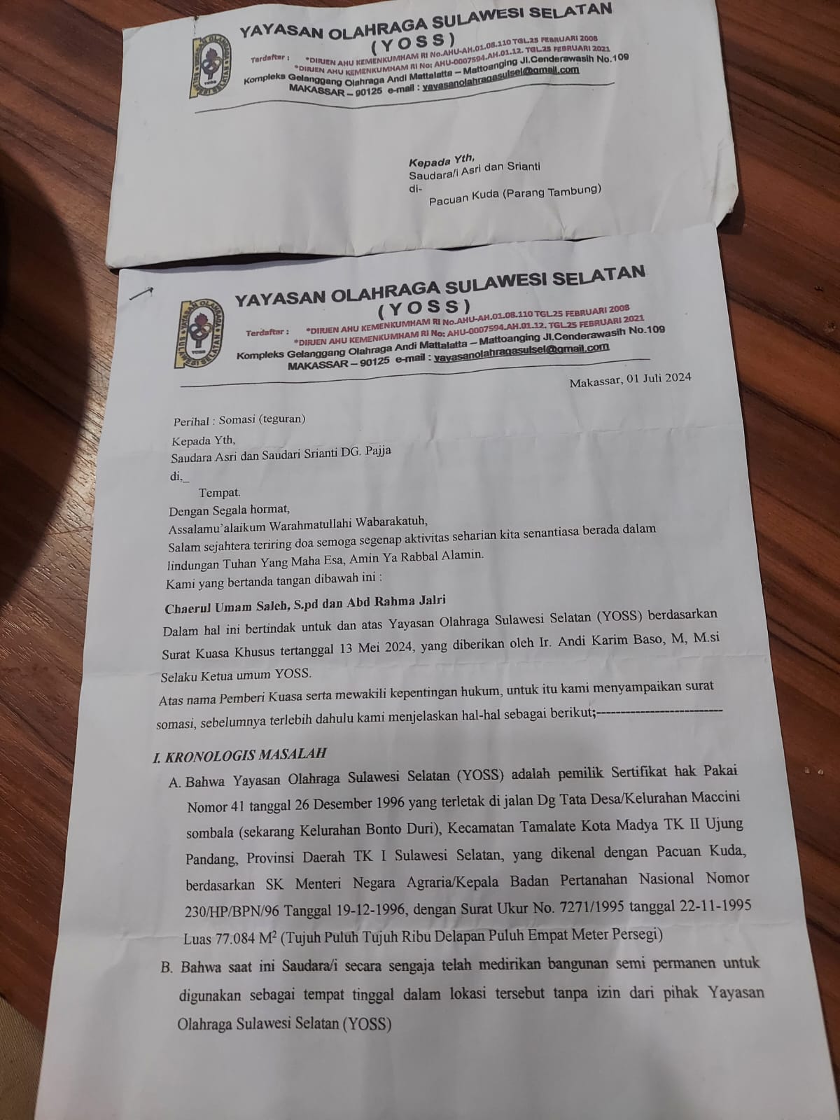 Dg Pajja beserta Swaminya di paksa menandatangani surat somasi tersebut yang bunyi nya Yos (yayasan olahraga Sulsel ) memberi surat kuasa kepada Hairul dan dg Ramang tertanggal 13 Mei 2024 oleh Andi Karim Baso selaku ketua umum Yos dengan dasar sertifikat hak pakai nomor 41 tanggal 26 Desember 1996 konon kabar nya sudah tidak berlaku lagi,