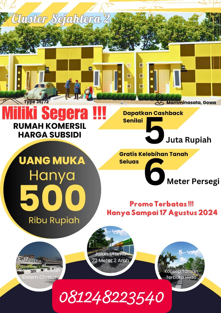 Jangan lewatkan kesempatan untuk memiliki rumah mewah dengan harga subsidi ini!, cukup Dp Rp. 500.000. Rupiah, free lahan kosong 6 m. Cukup aman dari bea caking perbankan.
