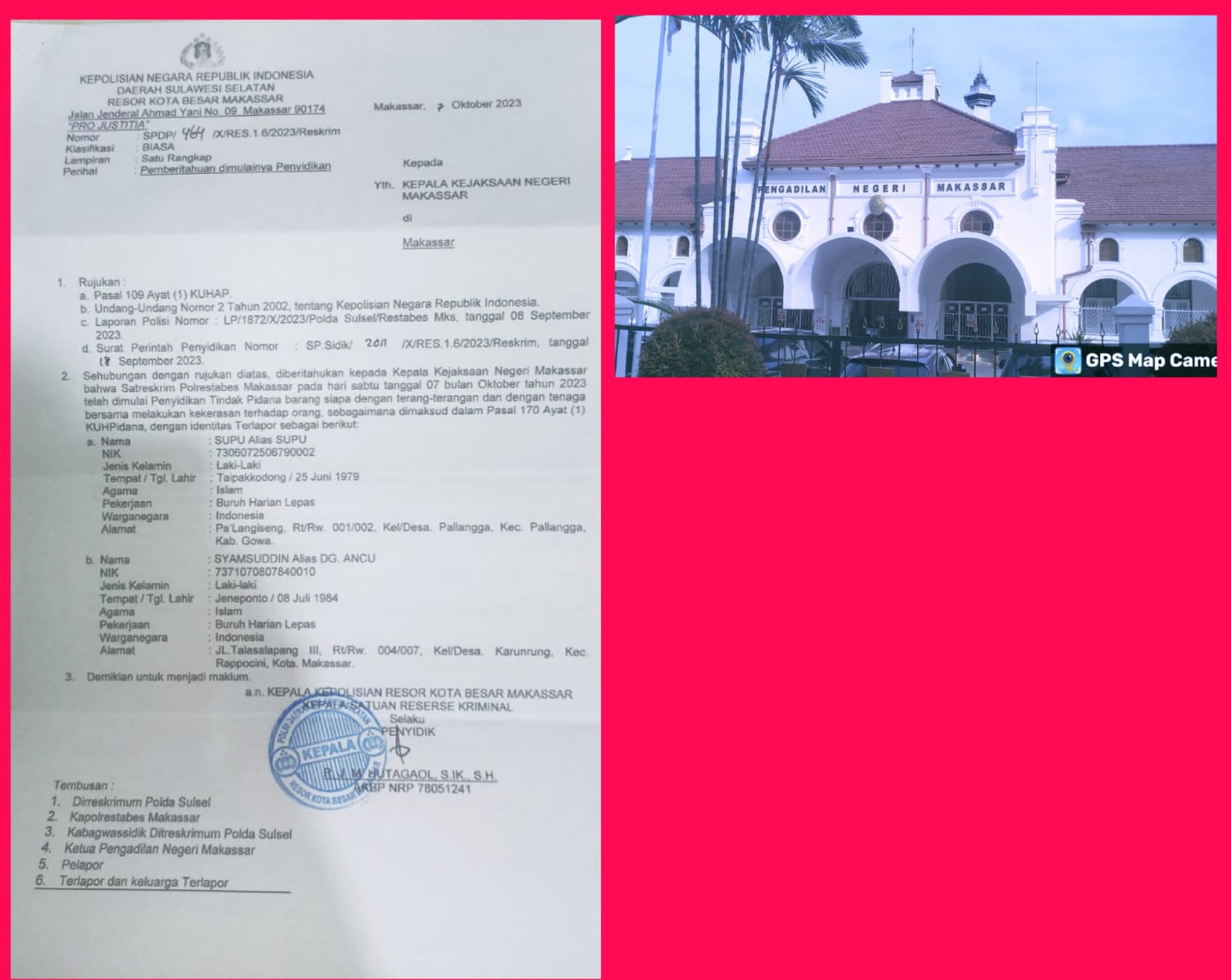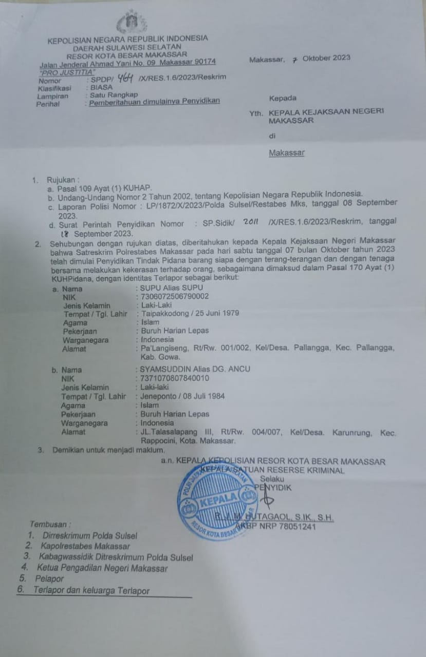sesuai Laporan Polisi LP/1872/IX/2023/ Polda Sulsel/Restabes Makassar 8 September 2023