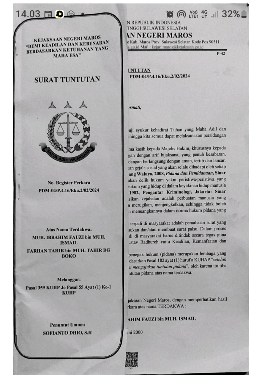 Atas dasar itu, jaksa menuntut majelis hakim yang pada persidangan kemarin dipimpin Firdaus Zainal, SH, MH menggantikan posisi Khairul, SH, MH, Ketua PN Maros yang kini pindah tugas sebagai Ketua PN Kediri, menjatuhkan pidana penjara selama 8 (delapan) bulan kepada terdakwa Muhammad Ibrahim Fauzi dan Farhan Tahir, serta memerintahkan agar keduanya segera dimasukkan kedalam tahanan setelah putusan dibacakan.