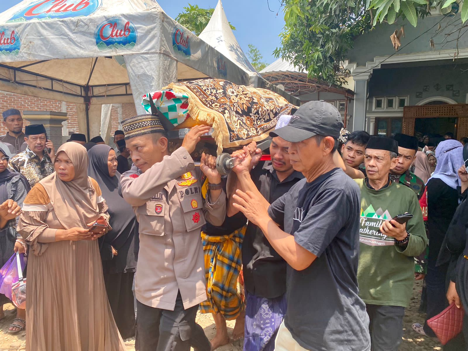 Prosesi pemakaman berlangsung dengan khidmat dan dihadiri oleh berbagai elemen masyarakat, mulai dari perangkat desa hingga tokoh agama.