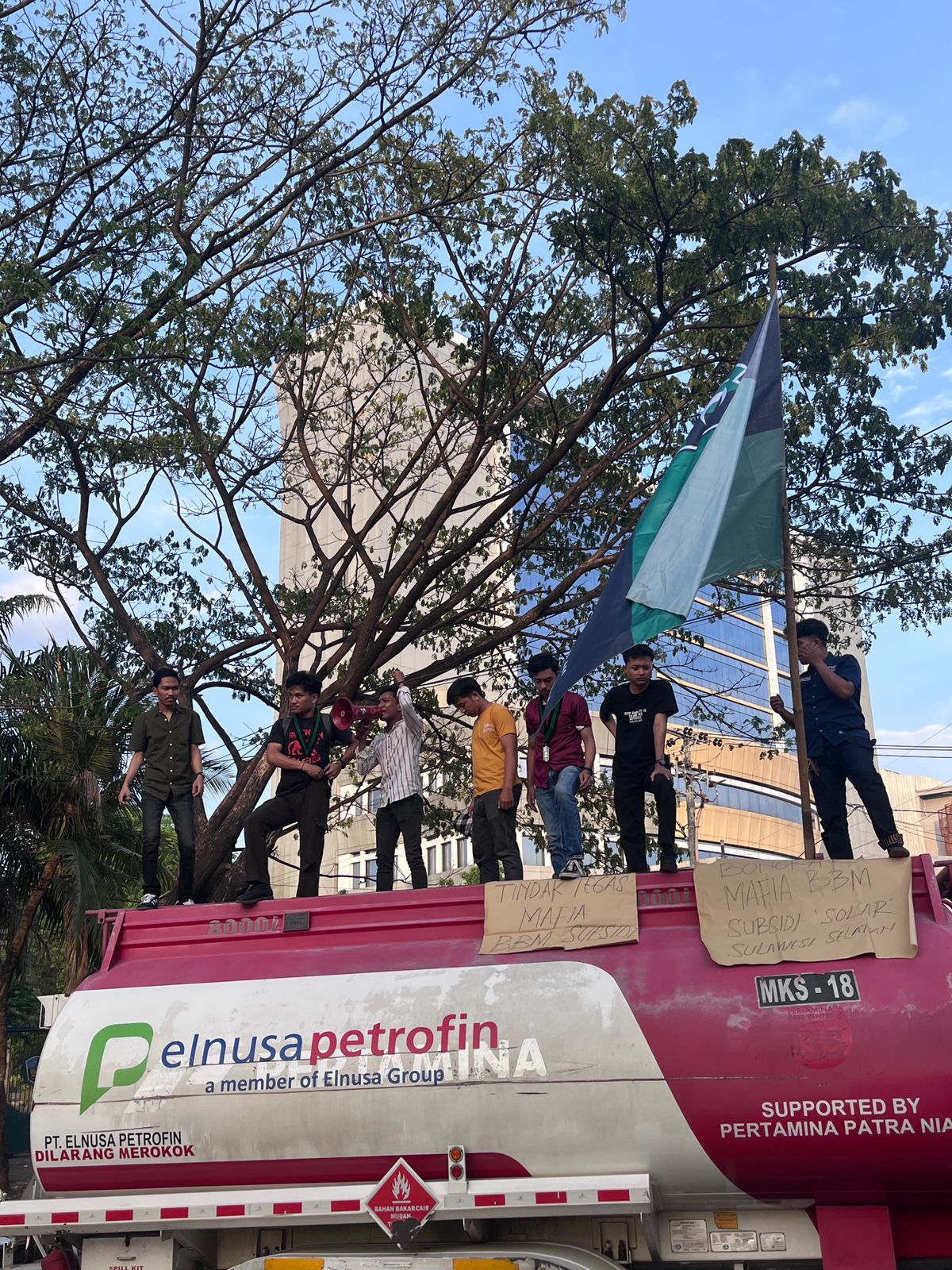 Peserta aksi sempat menahan mobil milik PT Pertamina yang melintas dan menjadikan panggung orasi sambil membentangkan alat peraga aksi yang bertulisan “Bongkar Mafia BBM (Solar Subsidi) di Sul-Sel. BBM Subsidi untuk Rakyat Tidak Mampu, Bukan untuk Industri/Perusahaan”.