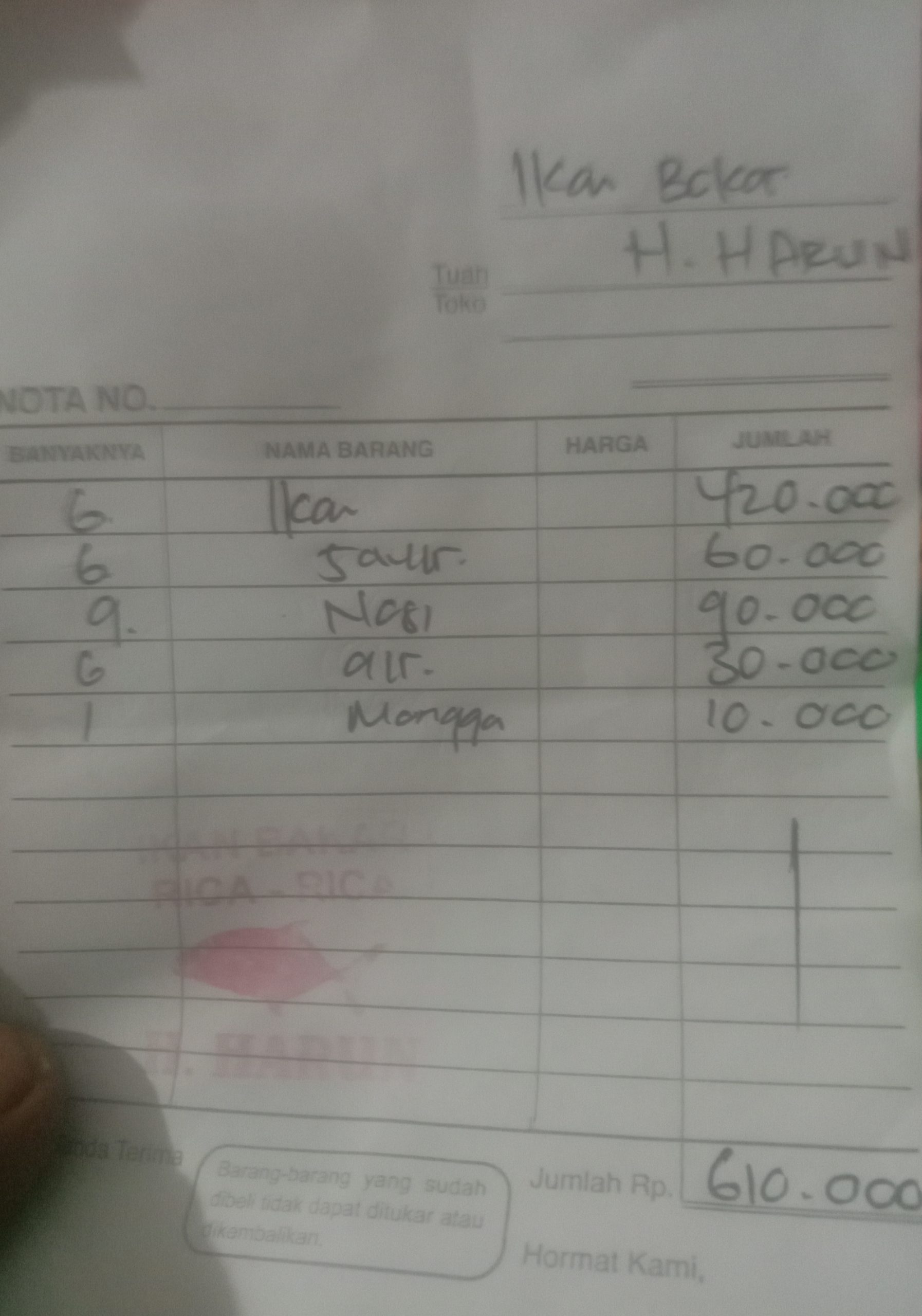 semangkok kecil sayur bening 10 ribu, racak mangga yang hanya sedikit di piring 10 ribu ,nasi sepiring kecil 10 ribu tambah air mineral di bandrol harga 610 ribu rupiah ‘ Agung tiba-tiba kaget’kenapa mahal sekali bu’jawab nya !saat nota pembayaran di serahkan kepada nya . dimana Agung tidak tahu harga satu porsi makanan tersebut ,dia baru tahu setelah di jelaskan oleh karyawan nya saat nota nya di berikan kepada nya , Agung pun terdiam sejenak dan bertanya ini bukan restoran atau rumah makan besar yang kena pajak .kenapa tidak di pajang Harga makanan nya?ucap agung marah”?anak Haji Harun pun menjawab memang sudah begitu pak,saya 12 tahun menjual tidak pernah ada yang komplen soal makanan yang saya jual langganan saya sudah pada tahu kalau harga nya mahal yang makan di sini anggota dewan ‘agung pun membalas okelah anggota dewan banyak uang bagaimana dengan masyarakat umum yang tiba-tiba datang makan dengan tidak bertanya harga ?pasti mereka terkejut ! saya ini merasa tertipu anda tidak jujur terhadap pembeli .tegas nya