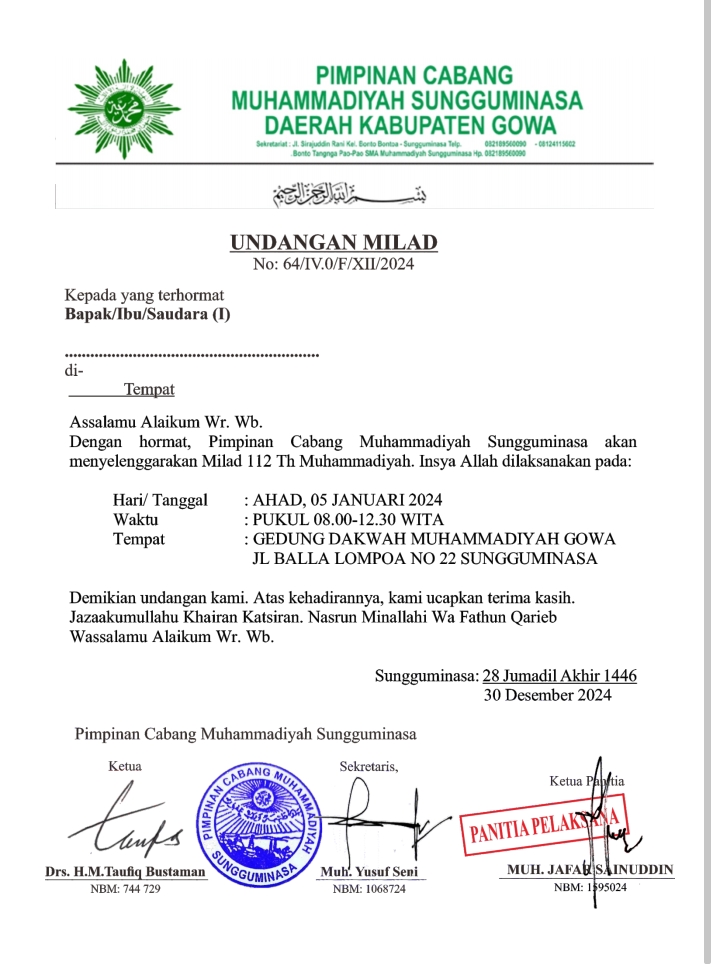 Pimpinan Cabang Muhammadiyah Sungguminasa berharap acara Milad ini dapat berjalan lancar dan sukses serta memberikan manfaat bagi seluruh umat.