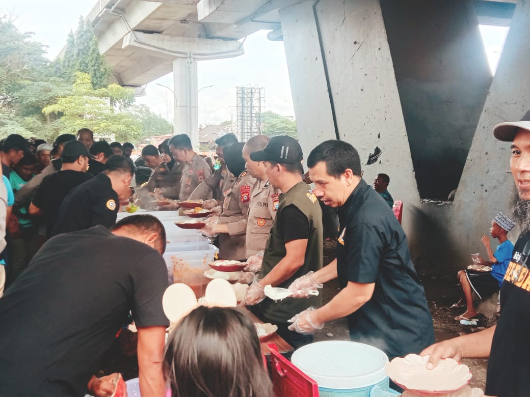 Makassar-Petirnews.net/Tim Pelajar bersama Binmas Polda Sulsel Berbagi sedekah makan gratis ratusan orang seruduk Fly over di jalan Pettarani Makassar Sabtu 25/1/2025 pukul 10.00Wita